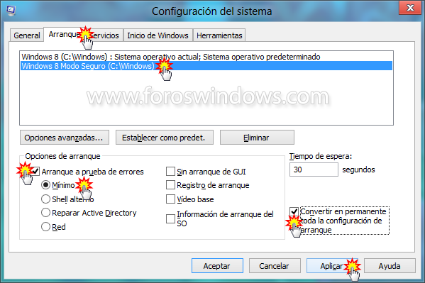En la misma ventana que tenemos abierta del símbolo del sistema escribimos msconfig y pulsamos intro para abrir la ventana de configuración del sistema. Pulsamos en la pestaña Arranque, seleccionamos la entrada que acabamos de crear (Windows 8 Modo Seguro), en las opciones de arranque activamos Arranque a prueba de errores, dentro dejamos marcado Mínimo o Red, Mínimo para arrancar en modo seguro y Red para arrancar en modo seguro con funciones de red. Marcamos la casilla Convertir en permanente toda la configuración de arranque. Para finalizar pulsamos en botón Aplicar.